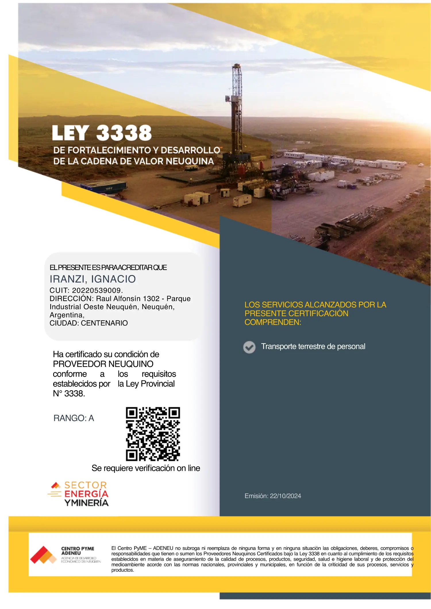 Nuestra misión en Logística Iranzi es ofrecer un servicio de transporte de personal confiable, seguro y eficiente, orientado a satisfacer las exigencias logísticas de las empresas del sector Oil & Gas. Nos comprometemos a garantizar traslados puntuales, confortables y en total cumplimiento con las normativas vigentes en materia de seguridad y medio ambiente. Con una flota moderna, un equipo altamente capacitado y procesos auditables, trabajamos día a día para contribuir a la continuidad operativa de nuestros clientes, minimizando riesgos y optimizando recursos.